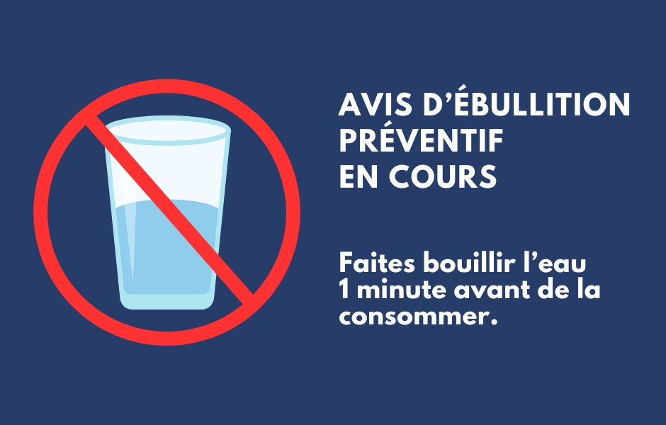 Jusqu’à la diffusion d’un avis contraire, laissez bouillir l'eau à grands bouillons pendant une minute avant de la consommer ou optez pour de l’eau du commerce embouteillée.